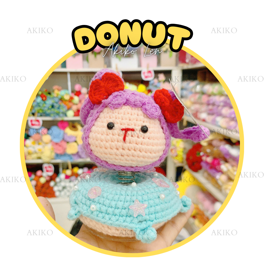 Sản phẩm là một món đồ len thủ công hình thú, kết hợp với thiết kế bánh donut. Dưới đây là một số đặc điểm nổi bật: